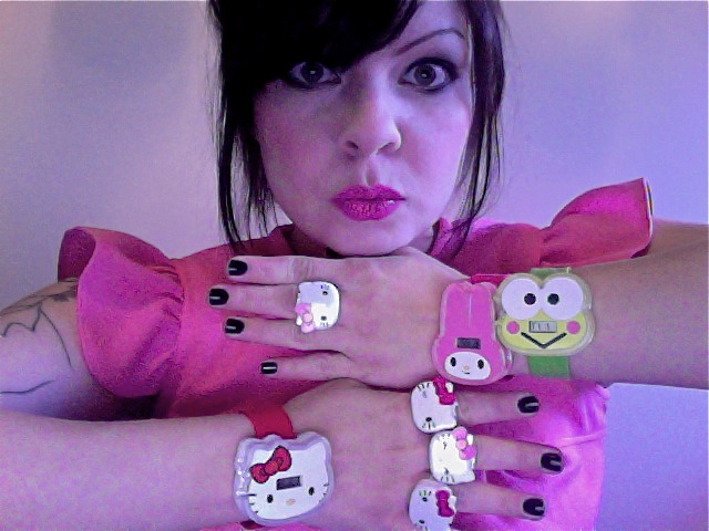 My table filled with all my fun jewelry, buttons and Sanrio perfumes